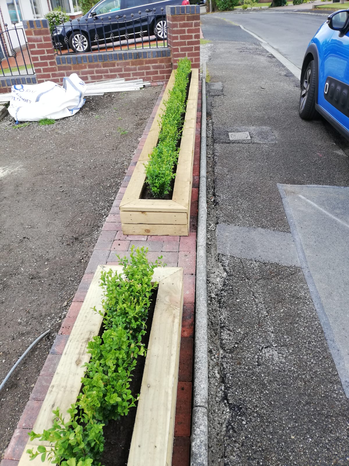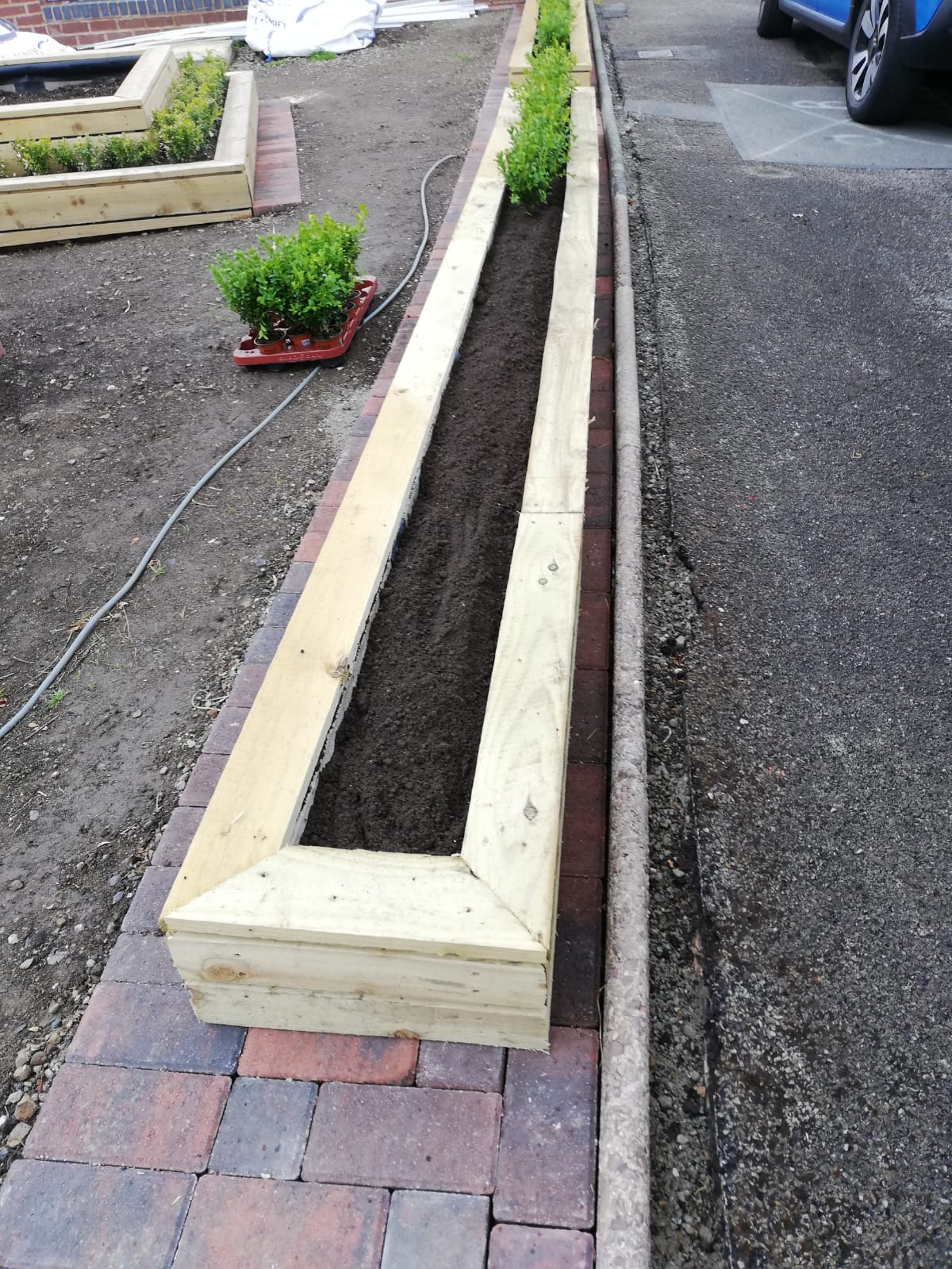 Now that the planter has been built and filled with a quality top soil, we can begin to introduce plants. In this example we have used buxus hedges.